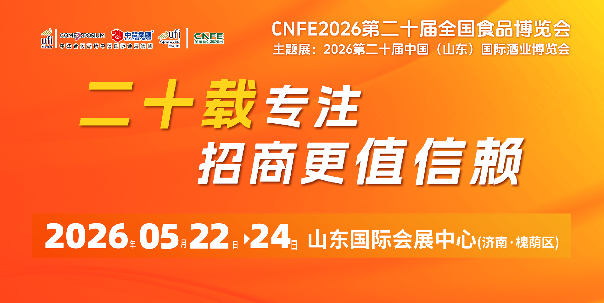 CNFE2026第二十屆全國食品博覽會將于2026年5月22-24日在濟南市山東國際會展中心舉辦?!局黝}展:2026第二十屆中國(山東)國際酒業(yè)博覽會,同期展:···
